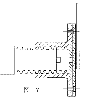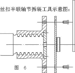 4.安装螺栓:把螺栓从法兰盘小孔外侧穿入,从另一件法兰盘大孔外侧穿出套上缓冲套、弹性垫圈、扭上螺母,用扳手将螺母把紧。如安装不适或拆除更换,又不损伤轴及半联,请按 图3至图7 作工具并安装。安装完毕后,转动自如无别劲为好。 5. 操作工须知:在启动设备前应先检查联轴器的螺母是否有松动或脱落,如有要及时将螺母用扳手把紧。应先空载启动设备1分钟后将负载管线阀门打开;停机顺序相反。(请每月将联轴器外部用机油涂刷一遍)